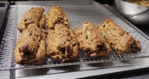 こちらが焼き上がったばかりのシュトーレンです。ナッツやレーズンがぎっしりと詰まった、香ばしい焼き色が美しい状態です。焼きたての熱々の状態から、次の工程へと進みます。