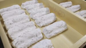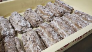 焼き上がった温かいシュトーレンに、たっぷりと粉砂糖をまぶしていきます。真っ白な粉砂糖に包まれた姿は、まるで雪化粧をしたよう。この白い装いには、素敵な意味が込められているんです。